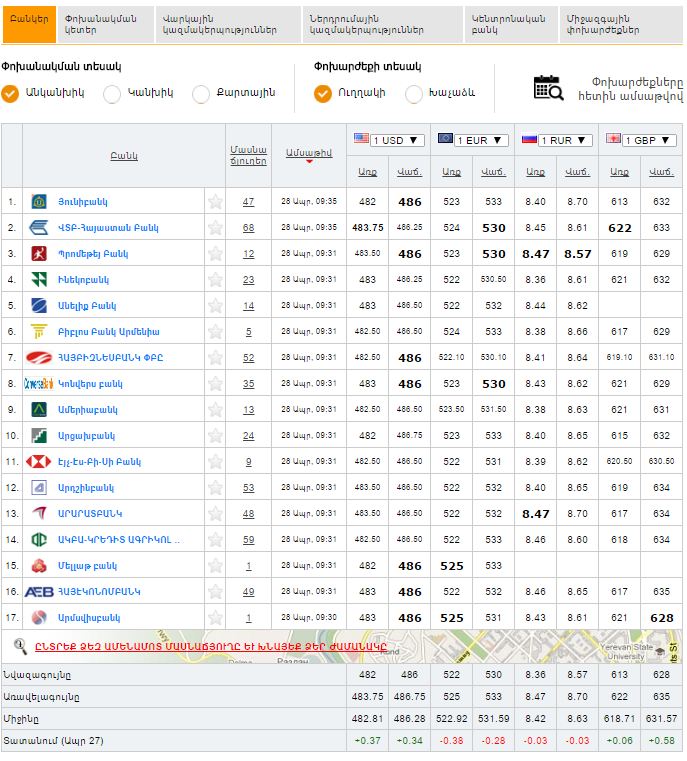 Ներկայացնում ենք Հայաստանի բանկերի կողմից գնվող և վաճառվող արտարժույթների փոխարժեքները ապրիլի 28 -ի դրությամբ՝ ըստ Rate.am-ի: