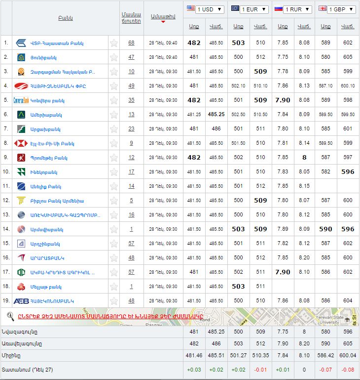 Ներկայացնում ենք Հայաստանի բանկերի կողմից գնվող և վաճառվող արտարժույթների փոխարժեքները դեկտեմբերի 28-ի դրությամբ՝ ըստ Rate.am-ի: