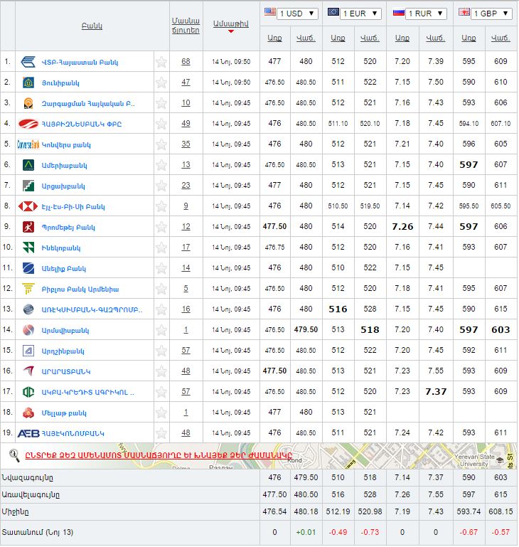 Արտարժույթների փոխարժեքները նոյեմբերի 14-ի դրությամբ