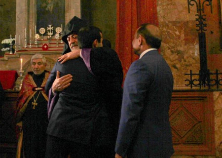 Լուսանկարում՝ Արգամ Աբրահամյանը, Արարատյան Հայրապետական թեմի առաջնորդ Նավասարդ արքեպիսկոպոս Կճոյանը եւ վարչապետ Հովիկ Աբրահամյանը