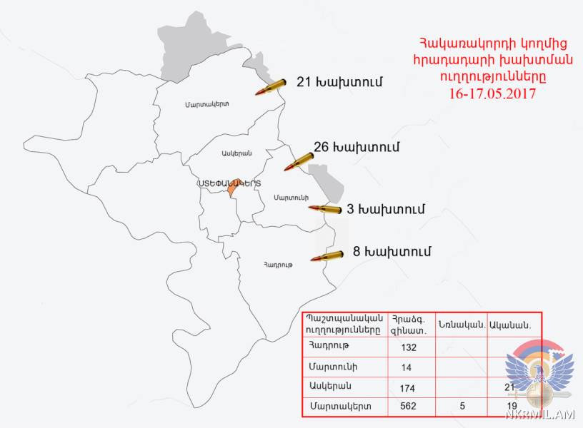 Մայիսի 16-ին և լույս 17-ի գիշերը արցախա-ադրբեջանական հակամարտ զորքերի շփման գծում հակառակորդը տարբեր տրամաչափի հրաձգային զինատեսակներից, հրադադարի պահպանման ռեժիմը խախտել է մոտ 60 անգամ՝ հայ դիրքապահների ուղղությամբ արձակելով ավելի քան 900 կրակոց: