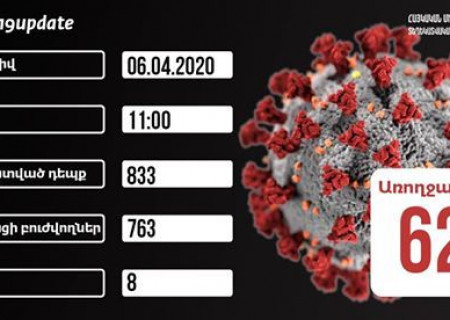 6 Ապրիլ, 2020 Հայաստանում կորոնավիրուսի հաստատված դեպքերի թիվը՝ այս պահի դրությամբ Tweet Ինչպես արդեն հայտնել էր վարչապետ Փաշինյանը, կորոնավիրուսի վարակման ընդամենը 11 նոր դեպք է գրանցվել. 263 թեստավորումից միայն 11-ն է դրական եղել։ Ունենք մահվան ևս մեկ դեպք։ Այսպես, Հայաստանում կորոնավիրուսով հաստատված դեպքերի թիվը հասել է 833-ի։