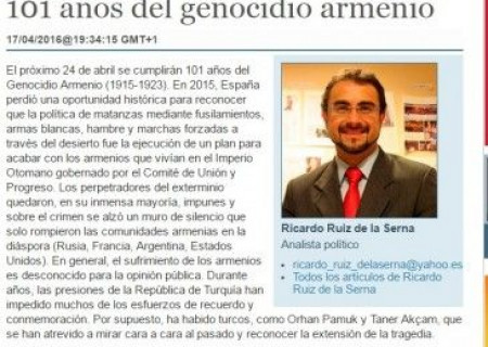 Ս.թ. ապրիլի 24-ին լրանում է Հայոց Ցեղասպանության 101 տարին (1915-1923թթ.): 2015թ.-ին Իսպանիան կորցրեց պատմական հնարավորություն ճանաչելու, որ «Միություն և առաջընթաց» կոմիտեի կողմից կառավարվող Օսմանյան Կայսրությունում իրականացրած սպանությունների քաղաքականությունը՝ գնդակահարությունների, սառը զենքերի, սովի մատնելու և ստիպողաբար իրականացված տեղահանումները դեպի անապատ՝ ուղղված էին մի ծրագրի իրականացմանը, որի նպատակը Օսմանյան կայսրությունում բնակվող հայերի ոչնչացումն էր: