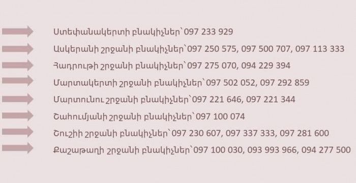 Նշված գործընթացը համակարգված կազմակերպելու նպատակով, ինչպես նաև լրացուցիչ տեղեկություններ ստանալու համար, խնդրում ենք մինչև Արցախի Հանրապետություն վերադառնալը հերթագրվել՝ զանգահարելով հետևյալ հեռախոսախոսահամարներով.