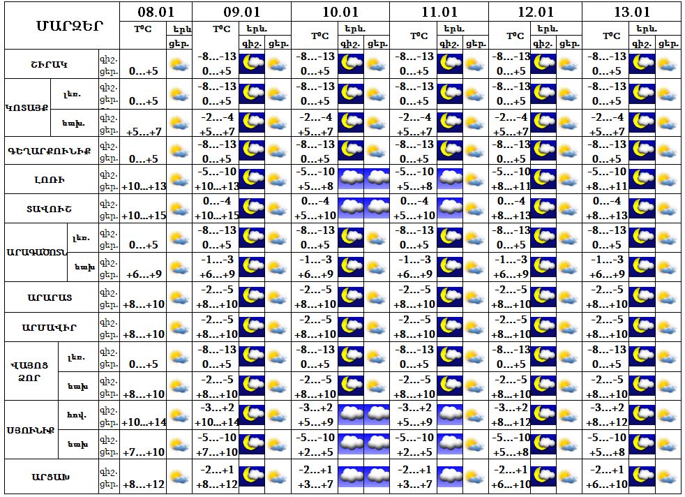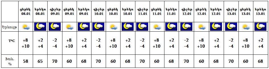 Հունվարի 8-ի ցերեկը, 9-13-ը սպասվում է առանց տեղումների եղանակ: