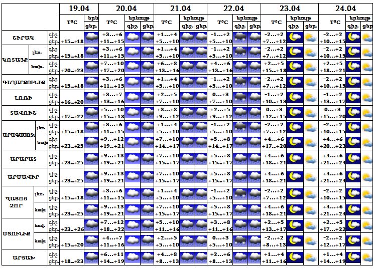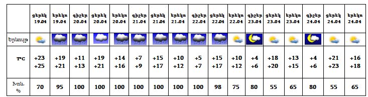 Ապրիլի 20-ին՝ կեսօրից հետո, 21-22-ը ժամանակ առ ժամանակ սպասվում է անձրև, 23-24-ը սպասվում է առանց տեղումների եղանակ: