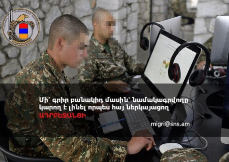 Կոչ ենք անում ՀՀ բոլոր քաղաքացիներին զերծ մնալ սոցիալական ցանցերում անծանոթների հետ ռազմական բնույթի թեմաներով շփումներից, միաժամանակ տեղեկացնում ենք, որ նմանատիպ խնդիրներին առնչվելու դեպքում, հետադարձ կապ հաստատել [email protected] էլեկտրոնային հասցեի միջոցով: