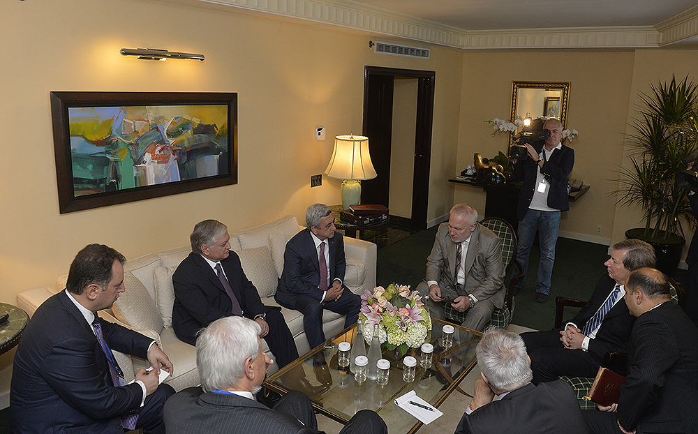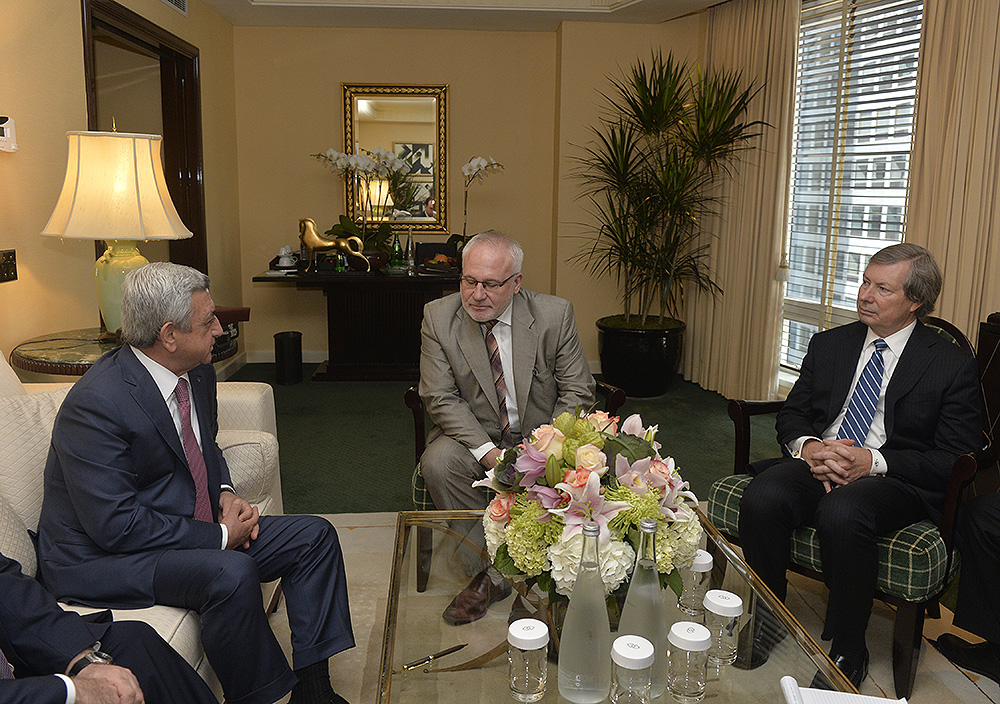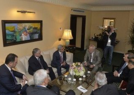 Նախագահ Սերժ Սարգսյանն այսօր Նյու Յորքում հանդիպում է ունեցել ԵԱՀԿ Մինսկի խմբի համանախագահներ Իգոր Պոպովի (Ռուսաստան), Ջեյմս Ուորլիքի (ԱՄՆ), Պիեռ Անդրիոյի (Ֆրանսիա) և ԵԱՀԿ գործող նախագահի անձնական ներկայացուցիչ Անջեյ Կասպրշիկի հետ: Այս մասին հայտնում են ՀՀ Նախագահի աշխատակազմի հասարակայնության և տեղեկատվության միջոցների հետ կապերի վարչությունից։ Հանդիպմանը զրուցակիցները քննարկել են ԵԱՀԿ Մինսկի խմբի շրջանակներում ղարաբաղյան հիմնախնդրի խաղաղ կարգավորման բանակցային գործընթացը և այս փուլում առկա մտահոգությունները, մասնավորապես՝ վերջին օրերին հրադադարի խախտման հետևանքով առաջացած լարվածությունը: