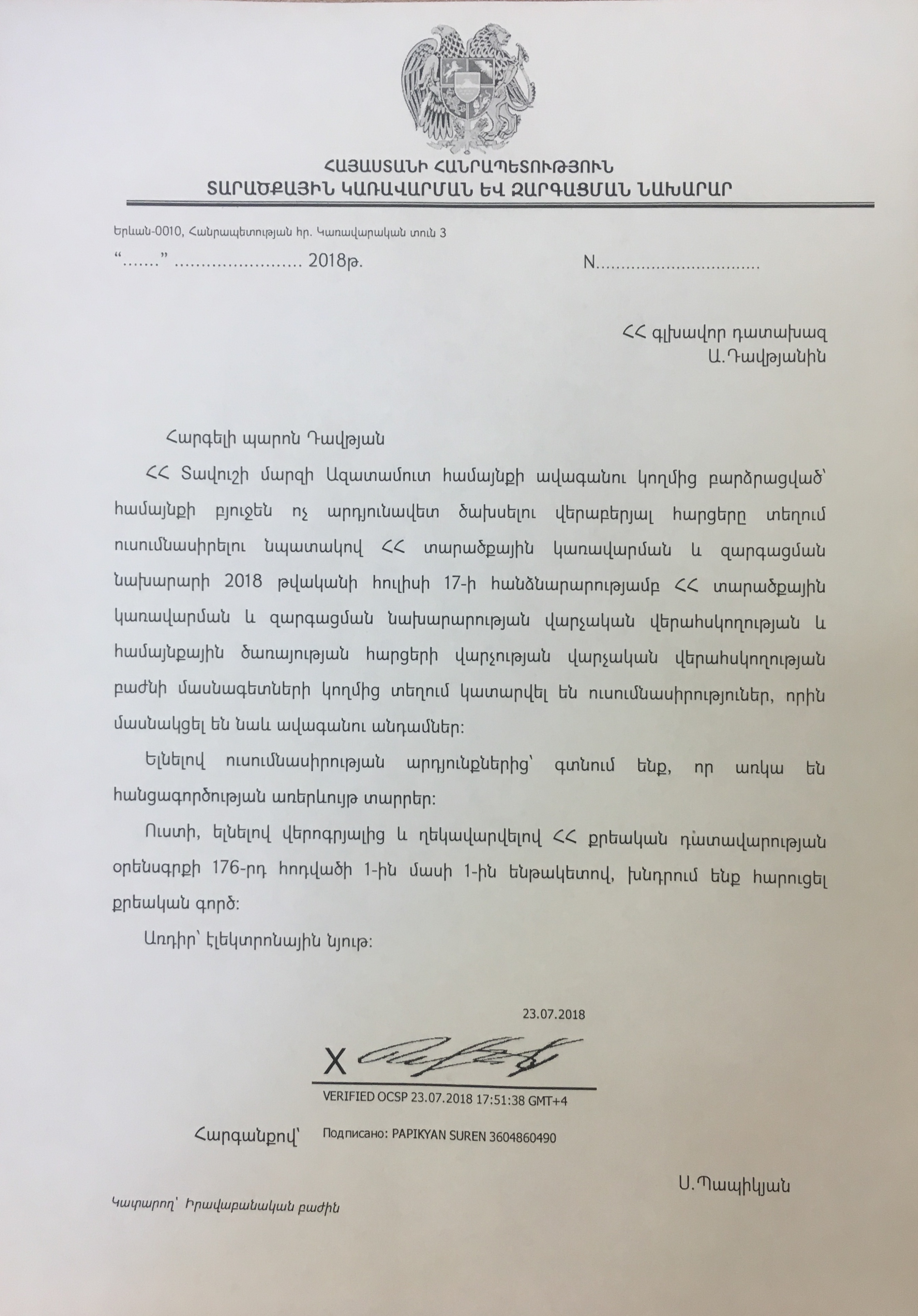 ՏԿԶ նախարարը դիմել է գլխավոր դատախազին՝ խնդրելով քրգործ հարուցել Ազատամուտի համայնքապետի նկատմամբ