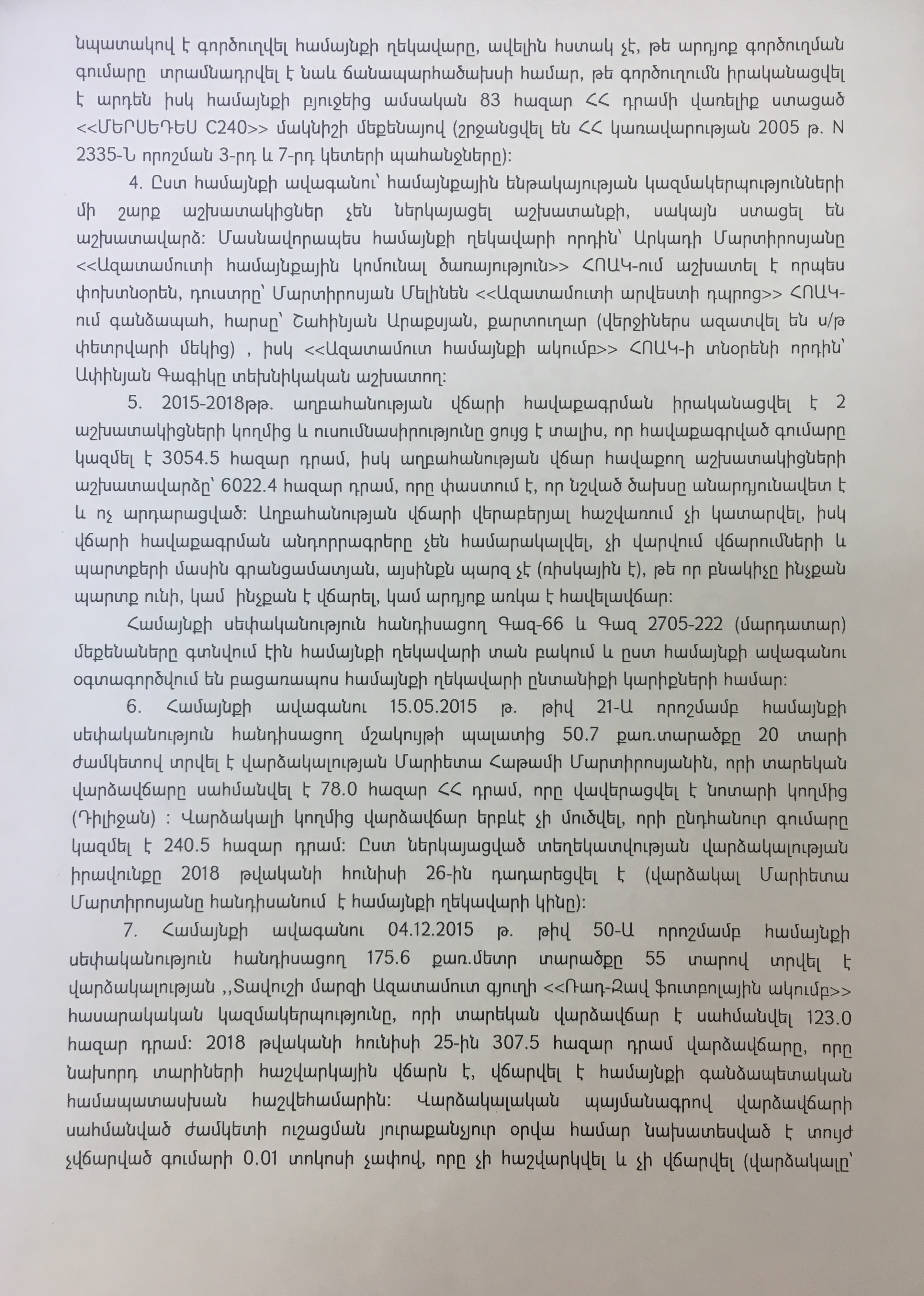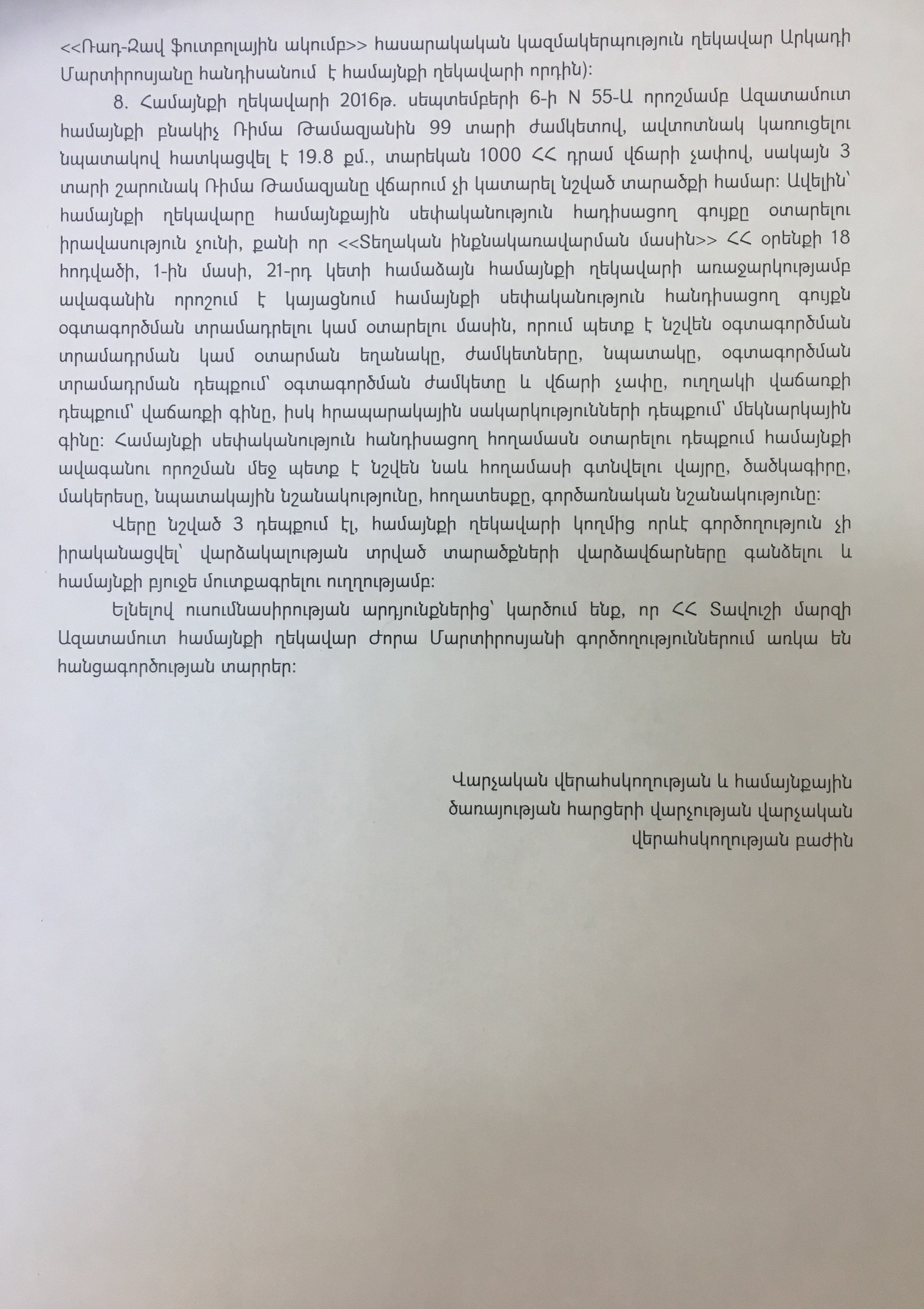 Հաղորդագրության մեջ ասվում է. «Ավելի վաղ նախարար Սուրեն Պապիկյանին էր դիմել Տավուշի մարզի Ազատամուտ համայնքի ավագանու անդամներից մեկը՝ տեղեկացնելով համայնքի ղեկավարի կողմից համայնքային բյուջեն ոչ արդյունավետ ծախսելու, համայնքային ենթակայության հողերը և շենքերը ապօրինի օտարելու և իր ընտանիքի անդամներին վարձակալությամբ տրամադրելու, ինչպես նաև սահմանված վարձավճարները բյուջե չմուտքագրելու մասին։
