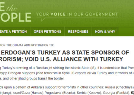 ԱՄՆ-ում Թուրքիայի դեմ ուղղված ստորագրահավաք է սկսվել: Թուրքալեզու «amerikaninsesi.com» լրատվակայքի տեղեկացմամբ՝ «Նախագահ Էրդողանի ղեկավարած Թուրքիան պետք է հռչակվի որպես ահաբեկչությանն աջակցող պետություն և պետք է վերջ դրվի Ամերիկայի հետ դաշնակցությանը» վերնագրով ստորագրահավաքը մեկնարկել է Սպիտակ տան պաշտոնական կայքէջում: