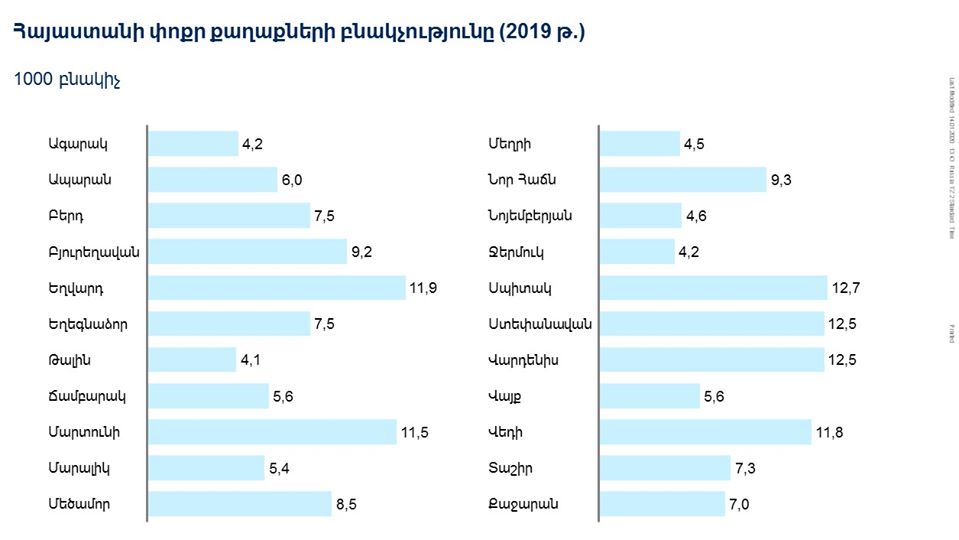 բ) Եթե Կառավարությունը համարում է, որ առանձին վերցված ծննդատան համար շեմը 150 ծնունդն է տարեկան, ապա պրակտիկորեն ցանկացած համայնք, որը չունի 15 000-ից ավել բնակչություն, ծնելիության հետագա անկման պայմաններում հայտնվելու է ծննդատան փակման վտանգի առաջ։ Կից պատկերում ներկայացված են Հայաստանի այն քաղաքային բնակավայրերը, որոնք ունեն 4 000 - 15 000 բնակչություն։ Այսօր մենք ունենք 22 այդպիսի բնակավայր, որում միասին վերցված ապրում է մոտ 174 հազար բնակիչ, իսկ նրանց մոտակա գյուղերի հետ՝ ավելի քան 300 հազար: Այս բոլոր բնակավայրերը կարող են մնալ առանց ծննդատան, և դա կարող է էապես անդրադառնալ նրանց ընդհանուր ապագայի վրա, մանավանդ սահմանամերձ և հեռավոր քաղաքների՝ ինչպիսիք են Ճամբարակը, Ագարակը, Վարդենիսը, Նոյեմբերյանը, Բերդը, Քաջարանը, և այլն։ Ծննդատների փակվելը լրացուցիչ խթան կդառնա այս բնակավայրերից արտագաղթի, և մեծ հավանականությամբ, մարդիկ ընդհանրապես կհեռանան երկրից։
