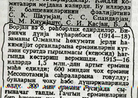 Այդ մասին է վկայում 1980 թվականին Բաքվում հրատարակված «Ադրբեջանական խորհրդային հանրագիտարան»-ի (10 հատոր) IV հատորի 84-րդ էջում տպագրված տեքստը, որում մասնավորապես ասվում է. «…Առաջին համաշխարհային պատերազմի (1914-18) ժամանակաշրջանում Օսմանյան կառավարությունն իշխանության տեղական մարմիններին հանձնարարական տվեց հայերին զանգվածային ոչնչացման` գենոցիդի (ցեղասպանության) ենթարկելու մասին: 1915-16-ին ոչնչացվեց ավելի քան 1.5 մլն հայ։ Ավելի քան 600 հազ. հայ քշվեց Միջագետքի անապատները, նրանց մեծ մասը մահացավ բանտային ճամբարներում: 300 հազ. հայ ապաստան գտավ Ռուսաստանում: Իսկ փախստական հայերի մի մասն ապաստանեց Մերձավոր Արևելքի, Եվրոպայի և Ամերիկայի երկրներում…»: Մեջբերման մեջ հստակորեն վկայվում է Հայոց ցեղասպանության իրողության, 1.5 մլն հայի ոչնչացման, հայերի հայրենազրկման մասին, իսկ տեղի ունեցածը որակվում է որպես ՑԵՂԱՍՊԱՆՈՒԹՅՈՒՆ: