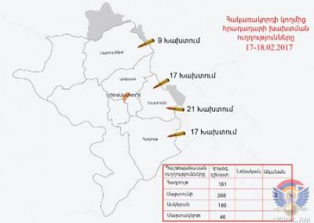 Փետրվարի 17-ին եւ լույս 18-ի գիշերը ղարաբաղա-ադրբեջանական հակամարտ զորքերի շփման գծում հակառակորդը տարբեր տրամաչափի հրաձգային զինատեսակներից, այդ թվում՝դիպուկահար հրացաններից, հրադադարի պահպանման ռեժիմը խախտել է 64 անգամ՝ հայ դիրքապահների ուղղությամբ արձակելով շուրջ 600 կրակոց: Արեւելյան ուղղությամբ ադրբեջանական զինուժը կիրառել է նաեւ 60 միլիմետրանոց ականանետ (3 արկ):