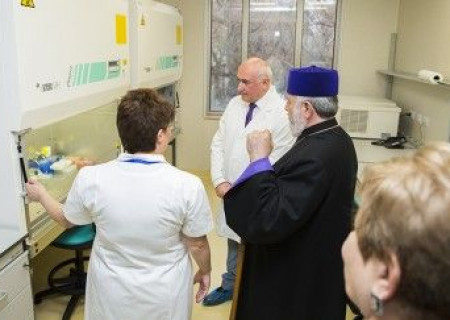 Ամենայն Հայոց Հայրապետին մուտքի մոտ դիմավորեցին կենտրոնի տնօրեն բ.գ.դ., պրոֆեսոր Սմբատ Դաղբաշյանը և կենտրոնի ղեկավար կազմը։ Նորին Սրբությունը պրոֆեսոր Ս. Դաղբաշյանի ուղեկցությամբ շրջայց կատարեց Արյունաբանական կենտրոնում, ծանոթացավ կենտրոնի պայմաններին և արդիական սարքավորումներով հագեցվածությանը։