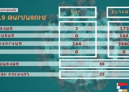 Ընդհանուր առմամբ, COVID-19-ը ախտորոշվել է 173 մարդու մոտ, որից 144-ը հաղթահարել է հիվանդությունը: Փաստացի բուժում է ստանում 29, ընդհանուր մեկուսացված է 66 քաղաքացի: