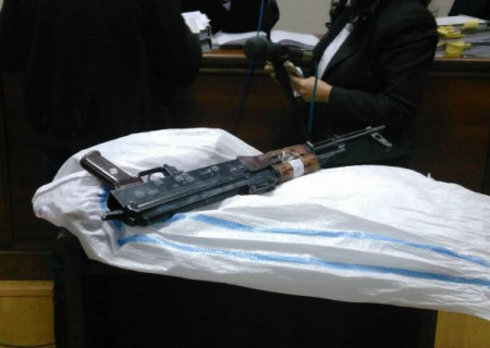 Այսօրվա նիստին իրեղեն ապացույց համարվող զենք-զինամթերքը զննության ենթարկվեց: Փորձաքննությունը կատարեց փորձագետ Արայիկ Ասլանյանը: Պաշտպանական կողմի փաստաբան Լուսինե Սահակյանը, հետևելով փորձաքննության ընթացքին, ասաց, որ իրեղեն ապացույցներ համարվող զենք-զինամթերքը փչացված են, վերջիններս պատշաճ ձևով փաթեթավորված չեն, կնիքն էլ բացակայում է: Փաստաբանը, որպեսզի դատարանին և փորձագետին ապացուցի, որ համապատասխան փաթեթավորված չէ, առանց փաթեթը վնասելու հեշտությամբ կարողացավ բացել և հանել զենքը: