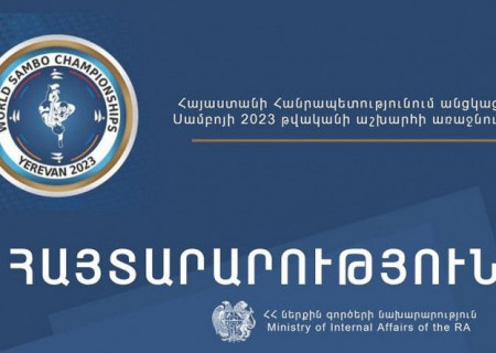 «Նոյեմբերի 10-ից 12-ը Հայաստանի Հանրապետությունում անցկացվող Սամբոյի 2023 թվականի աշխարհի առաջնության ընթացքում հասարակական կարգի և հասարակական անվտանգության ապահովման նկատառումներից ելնելով` հորդորում ենք միջոցառման վայր՝ Կարեն Դեմիրճյանի անվան մարզահամերգային համալիր, այցելել առանց զենքի և որպես զենք օգտագործվող առարկաների, ծակող-կտրող գործիքների, ապակյա տարաների, դյուրավառ նյութերի և նմանատիպ այլ իրերի ու առարկաների»,-նման հայտարարություն է տարածել ոստիկանությունը։