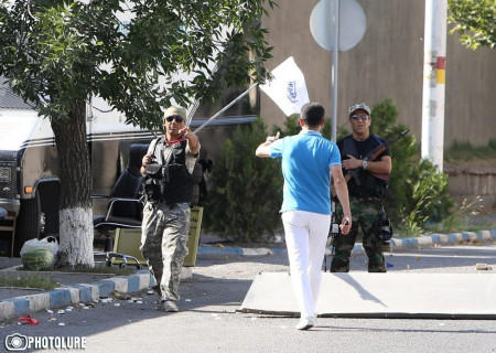 Armed group which occupied the police station in Erebuni district on the 7th day of the occupation freed the hostages demanding a meeting with media representatives. Yerevan, Armenia.