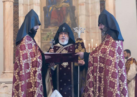 Այս պահին համախմբվել ենք այս սուրբ Տաճարի օրհնյալ կամարների ներքո միասնաբար աղոթելու Արցախից բռնի տեղահանված և գաղթական դարձած մեր քույրերի ու եղբայրների և նրանց իրավունքների վերականգնման, հատկապես գերեվարված հայորդիների ազատության և իրենց ընտանիքներ վերադարձի համար։ Մեր հայցն է, որ Երկնավոր Տերը զորացնի հայրենազուրկ ու տնազուրկ դարձած արցախցիներին, նվաստացումների ենթարկվող, ցավ ու տառապանք կրող մեր գերյալ զավակներին ու նրանց հարազատներին, որոնք նույնպես աղոթակից են մեզ Միածնաէջ այս սուրբ տաճարում։