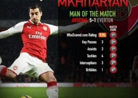 Հայաստանի ազգային հավաքականի և «Արսենալի» կիսապաշտպան Հենրիխ Մխիթարյանը հեղինակավոր «WhoScored» կայքի վարկածով ճանաչվել է ԱՊԼ-ի 26-րդ տուրի` «Էվերթոնի» հետ խաղի լավագույն ֆուտբոլիստը: