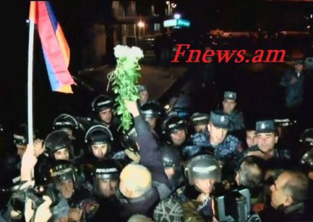 «Նոր Հայաստան» շարժման կազմակերպած երթի մասնակիցները փորձում են մոտենալ ՀՀԿ գրասենյակին, սակայն ոստիկանները պատ են կազմել գրասենյակի առջև և թույլ չեն տալիս առաջ շարժվել: Րաֆֆի Հովհաննիսյանի մոտ մի փունջ ծաղիկ կա, որոնք նա փորձում է դնել գրասենյակի մոտ: Երթը գլխավորում են Հիմնադիր խորհրդարանի անդամները եւ «Ժառանգություն» կուսակցության առաջնորդ Րաֆֆի Հովհաննիսյանը: Երթն ուղեկցում են մեծ թվով ոստիկաններ։ Հանրապետության փողոցը արդեն մեկ ժամից ավել է ինչ փակ է: