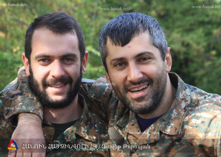 Ձախից Ռաֆայել Հովհաննիսյանն է` 2016թ.-ի Ապրիլյան պատերազմի հերոսներից մեկը: Խոցել է թշնամու երեք տանկ, Մարտական խաչի ասպետ է: Աջից Վահագն Վարագյանն է` գիտությունների թեկնածու, Արցախում տաս տարում տաս հազար ծառ տնկած մարդ: Այս տղաները «Կանաչ ապագա» բնապահպանական շարժում են ստեղծել, այս տղաները ողջ ամռան ամիսներին պայքարում էին Սևանը փրկելու համար, հետո ձերբակալվեցին Ամուլսարի ստորոտներում: Հիմա նրանք առաջնագծում են` զենքը ձեռքներին, հանուն Հայրենիքի, հանուն իրենց պատկերացրած «Կանաչ ապագայի»: